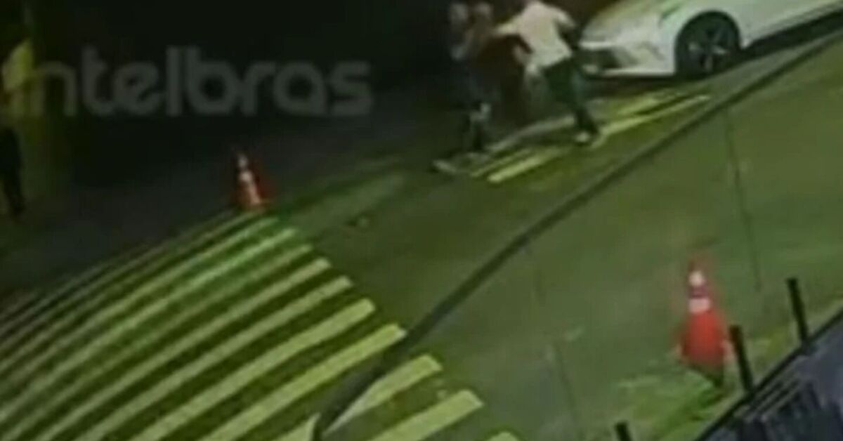 Em determinado momento, um deles se aproxima e o condutor reage com um empurrão Em seguida, os três passam a trocar agressões físicas. Não é possível identificar nas imagens se algum deles estava armado.