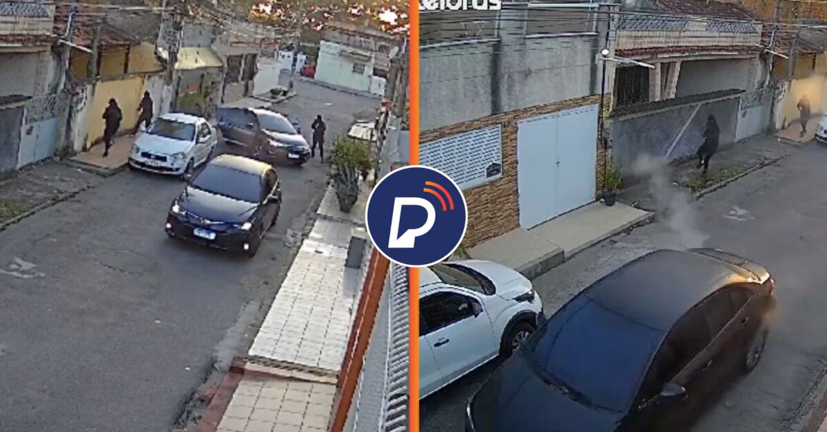 Câmeras de segurança flagraram o momento em que três criminosos encapuzados saíram de um carro e dispararam repetidamente contra o veículo do PM.
