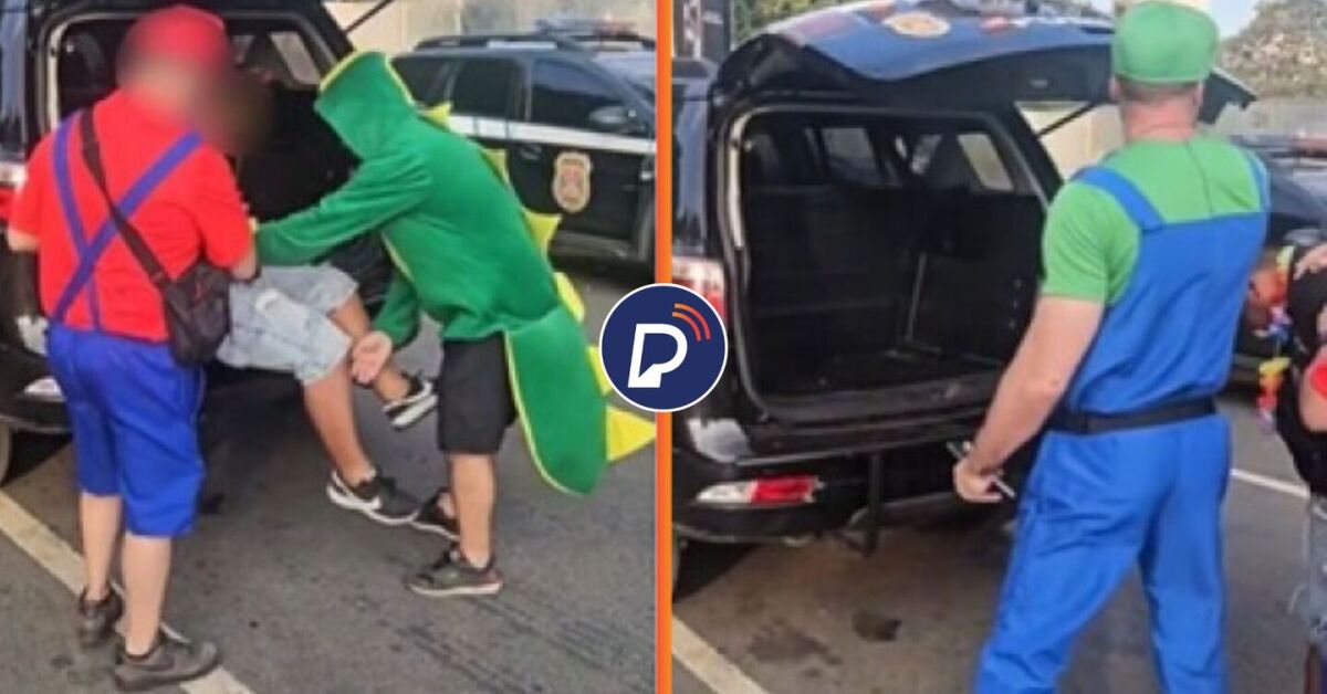 Três policiais fantasiados como personagens da série de videogames Super Mario Bros prenderam um suspeito de furto em um bloco de carnaval nas imediações do Parque Ibirapuera, na Zona Sul de São Paulo, na segunda-feira, 2 de março. Com ele, foram recuperados dois celulares furtados. (veja vídeo abaixo)