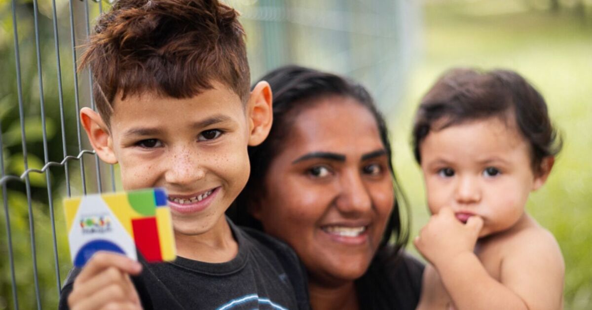 Mãe com seus dois filhos, segurando cartão do Bolsa Família. Foto: Lyon Santos/MDS