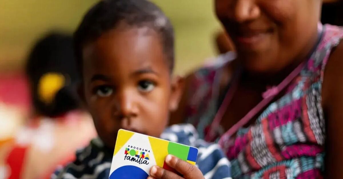 Criança segurando cartão do Bolsa Família ao lado da mãe. Foto: Lyon Santos/MDS