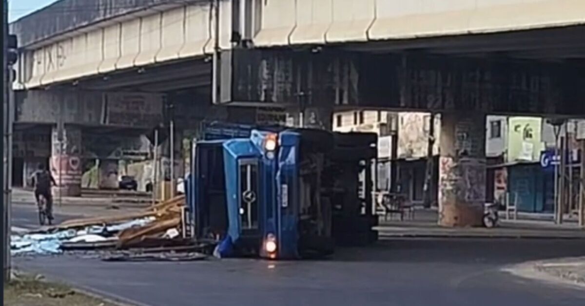 Informações iniciais apontam que o acidente ocorreu quando a carga ficou presa ao fazer um retorno sob um viaduto, fazendo com que o motorista perdesse o controle.