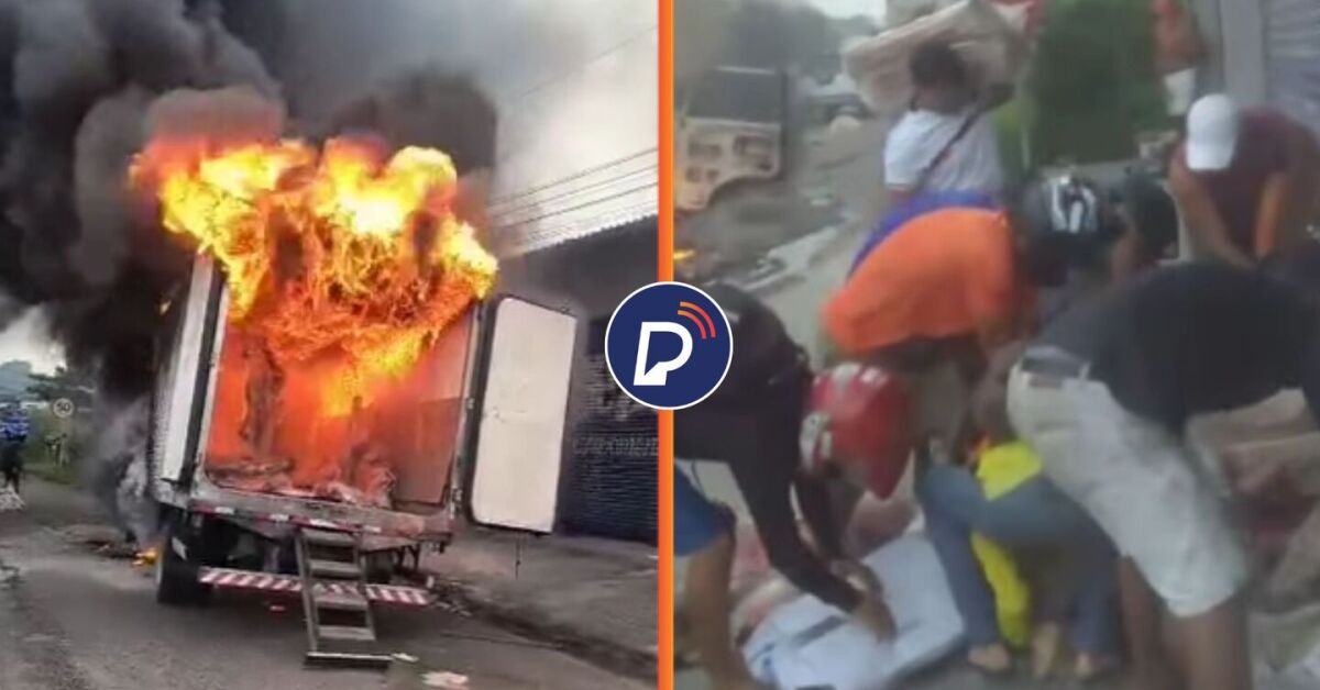 Caminhão em chamas e populares roubando carga. Fotos: Reprodução. Arte: Portal de Prefeitura