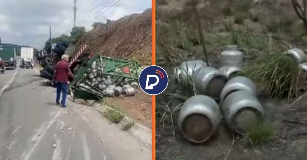Caminhão tombado na BR-101 e botijões de gás. Fotos: Reprodução. Arte: Portal de Prefeitura