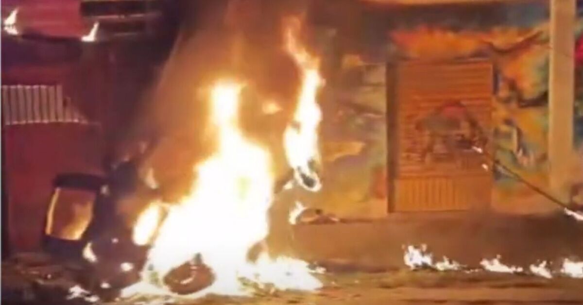Carro que colidiu com poste pegando fogo. Foto: Reprodução