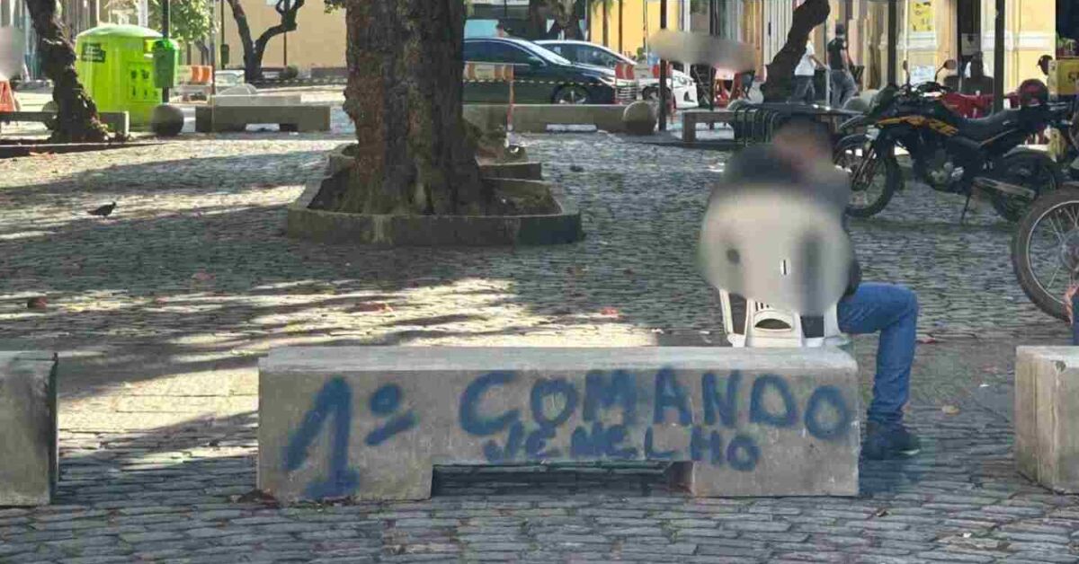 Uma pichação com a inscrição “1º Comando Vermelho” em um banco instalado na Rua da Moeda, no Centro do Recife, levantou preocupações sobre a presença da facção criminosa na região.