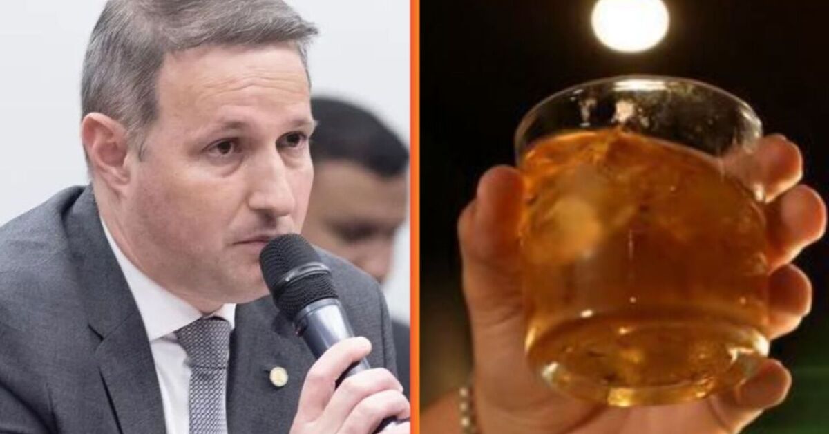 Guilherme Derrite e bebida destilada em copo. Fotos: Zeca Ribeiro/Câmara dos Deputados e Reprodução. Arte: Portal de Prefeitura