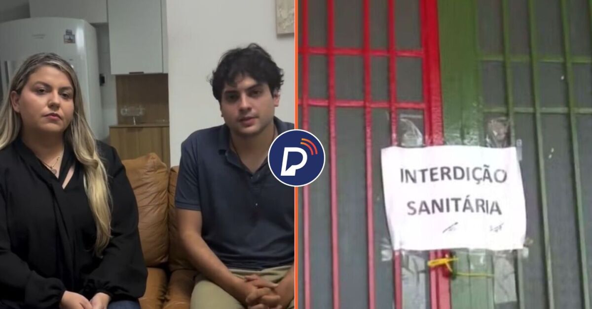 Dono de pizzaria La Favoritta ao lado da advogada e estabelecimento interditado. Fotos: Reprodução e TV Cabo Branco/Reprodução. Arte: Portal de Prefeitura