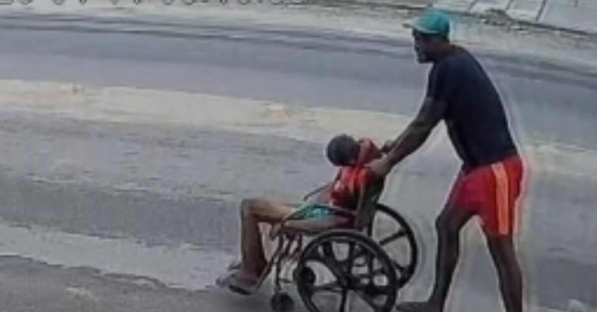Filho empurrando pai morto na cadeira de rodas. Foto: Reprodução/PCPE.