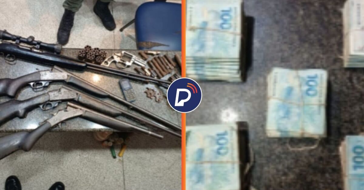 Armas e dinheiro apreendidos em Muribara, bairro do Grande Recife. Fotos: Divulgação/PMPE. Arte: Portal de Prefeitura