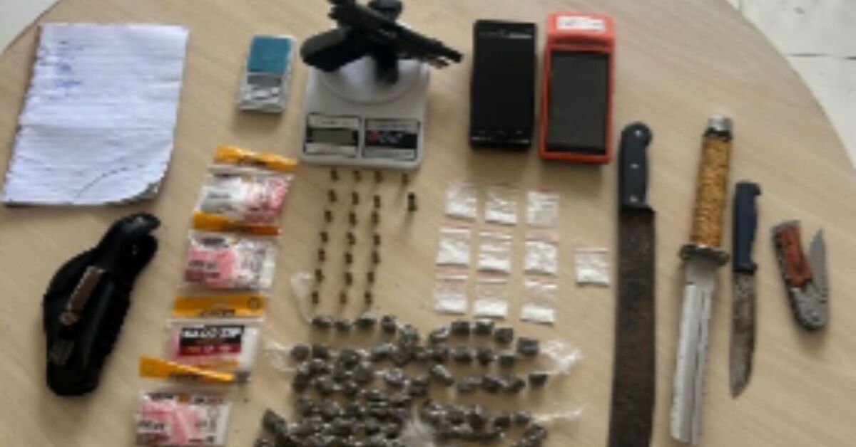Na ação foram apreendidos uma pistola calibre .32; 22 munições de mesmo calibre intactas; um estojo calibre .38 deflagrado; 10 porções de cocaína; 139 porções de maconha; quatro facas, duas balanças de precisão; um carregador de pistola; 400 embalagens de isopor; diversos eletrônicos, documentos e utensílios domésticos. A ocorrência foi encaminhada para a DP de Prazeres para adoção das medidas legais cabíveis.