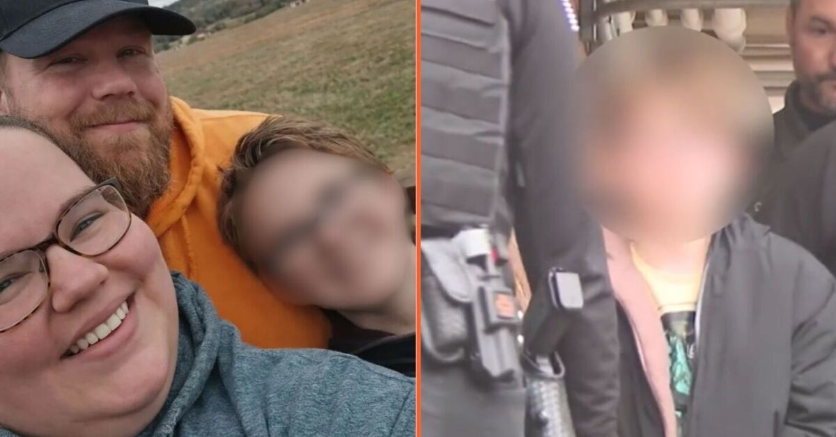 Menino com os pais adotivos e momento em que ele é conduzido algemado. Fotos: Reprodução. Arte: Portal de Prefeitura