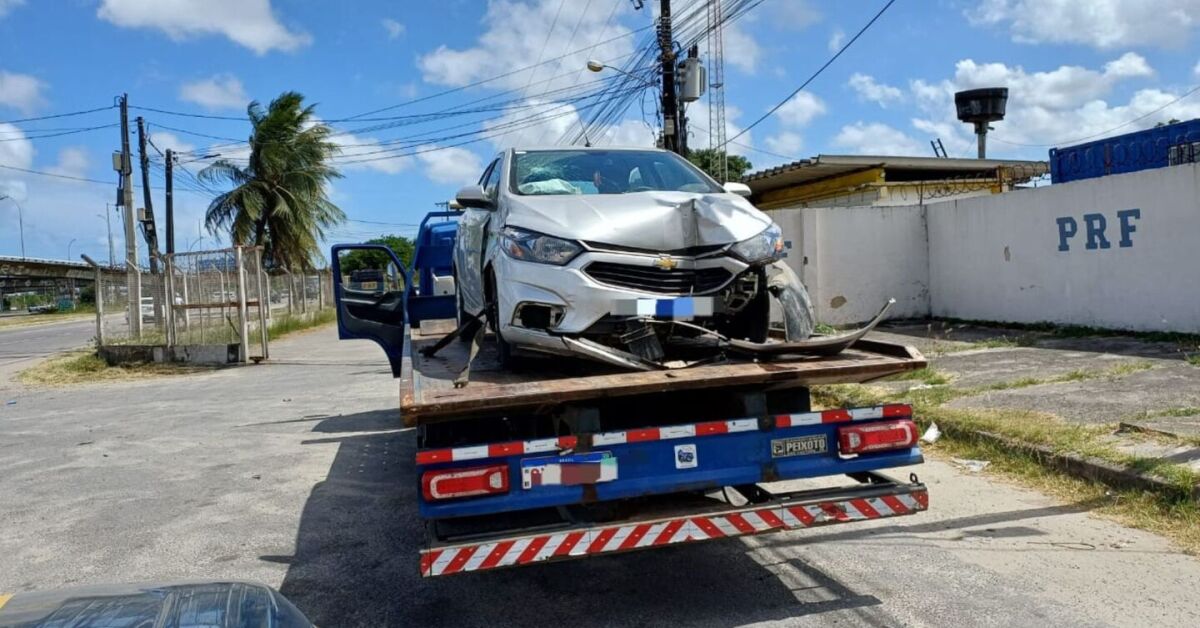 Carro utilizado na fuga sendo rebocado após colidir com veículos. Foto: PRF/Divulgação