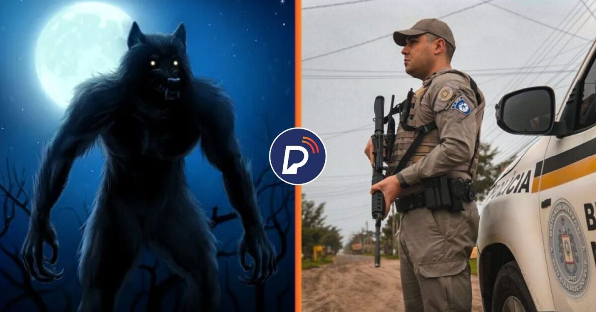 Imagem ilustrativa de um lobisomem e policial da Brigada Militar do Rio Grande do Sul. Fotos: Ilustrativa e Brigada Militar/Divulgação. Arte: Portal de Prefeitura