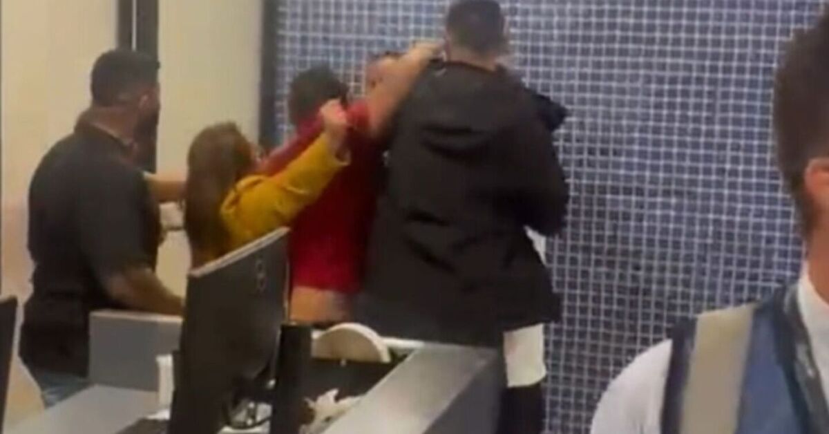 Imagens registradas por testemunhas mostram dois homens se agredindo verbal e fisicamente em meio a uma longa fila, enquanto outros passageiros tentavam intervir.