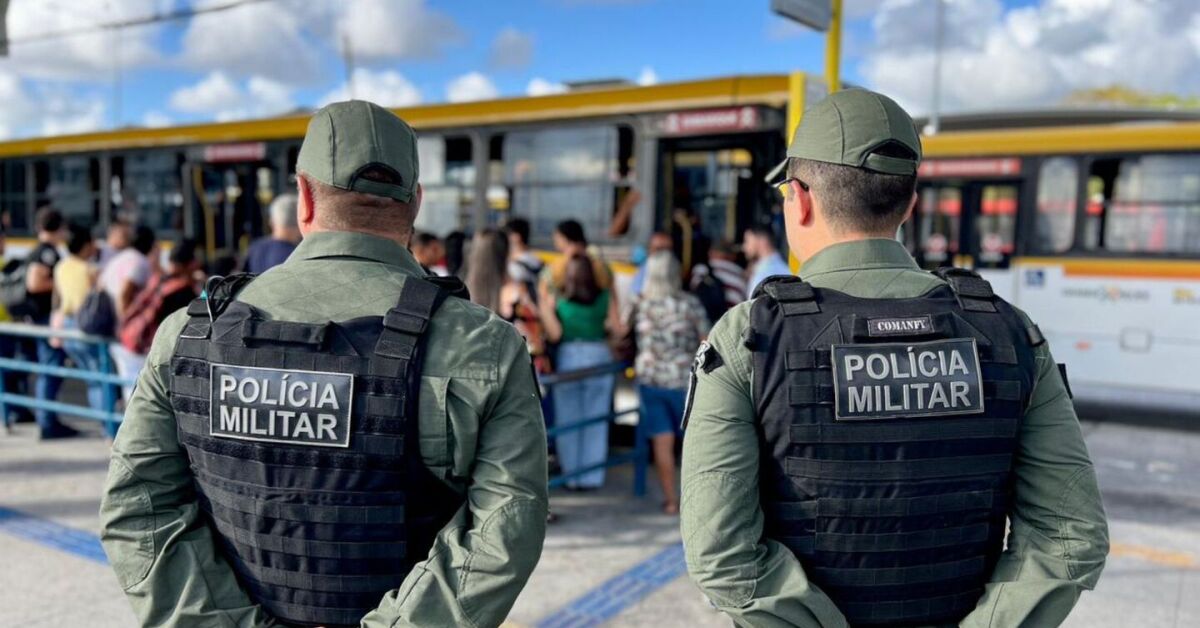 Policiais militares de Pernambuco garantindo segurança em ponto de ônibus. Foto: SDS/Divulgação