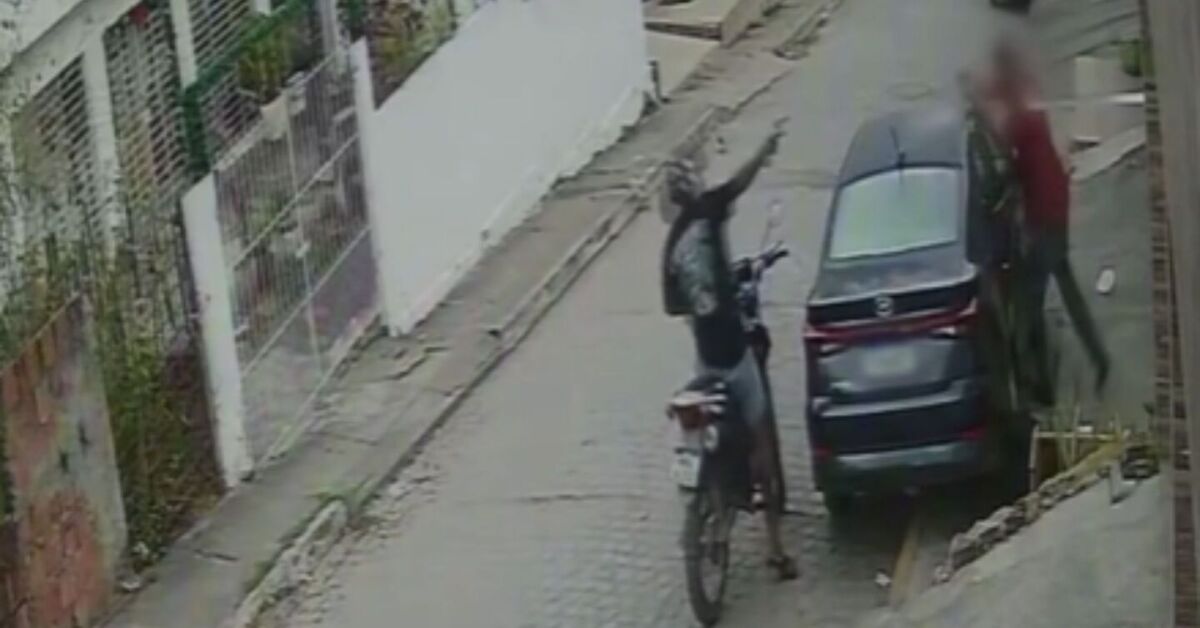 Imagens de câmeras de segurança mostram o momento em que o militar entrega os pertences exigidos: celular, carteira, dinheiro, cartão e a aliança. Quando o assaltante volta a atenção para outro ponto da rua, o PM consegue se abrigar atrás de um carro e dispara. Mesmo ferido, o suspeito reage e atira cinco vezes, sem atingir o policial. A dupla foge logo em seguida.