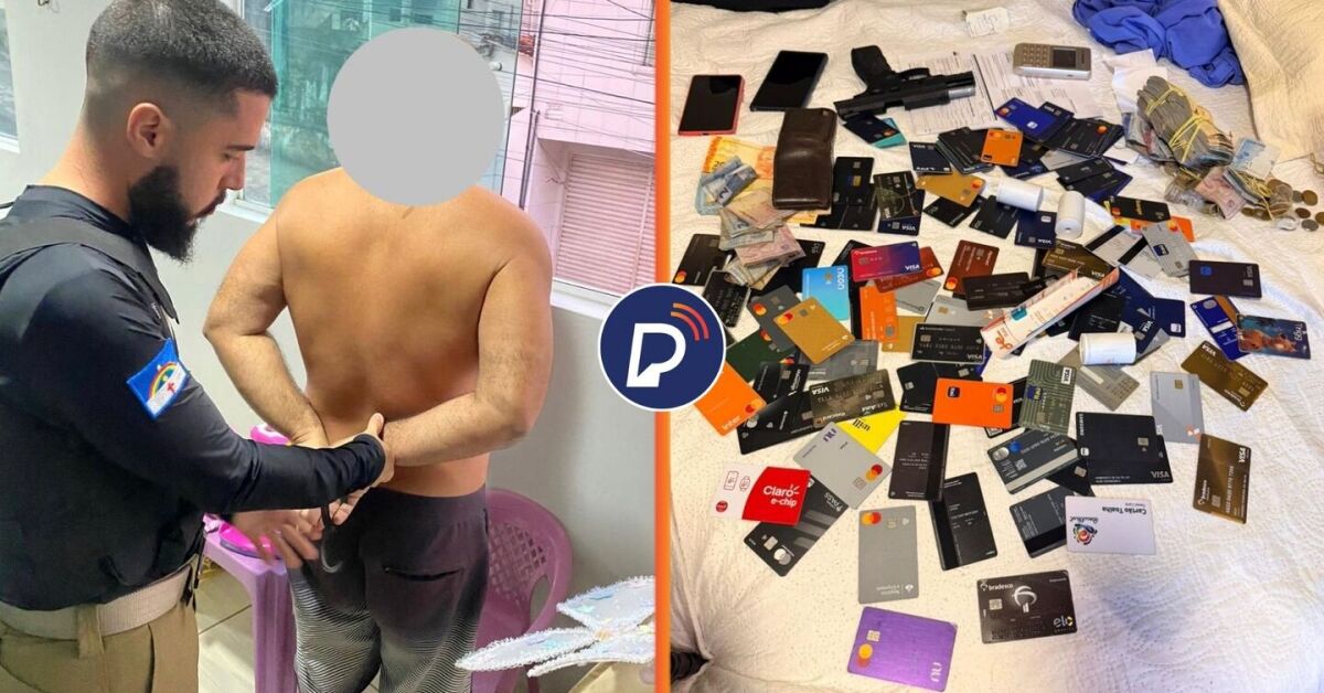 Policial Civil de Pernambuco prendendo envolvido e cartões apreendidos durante Operação Pacto de Sangue. Fotos: PCPE/Divulgação