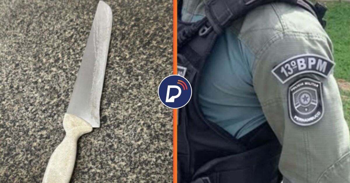 Faca peixeira utilizada em roubo, no Recife e policial do 13º BPM. Fotos: Divulgação. Arte: Portal de Prefeitura