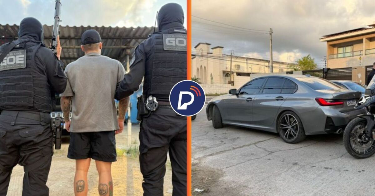 Homem envolvido em quadrilha sendo preso e BMW apreendida. Foto: Divulgação/PCPE