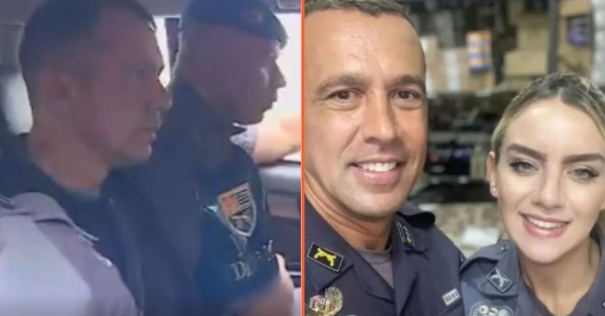 Tenente-coronel sendo preso e ele ao lado da esposa PM, que morreu. Fotos: Reprodução/g1 e Reprodução/Redes Sociais. Arte: Portal de Prefeitura