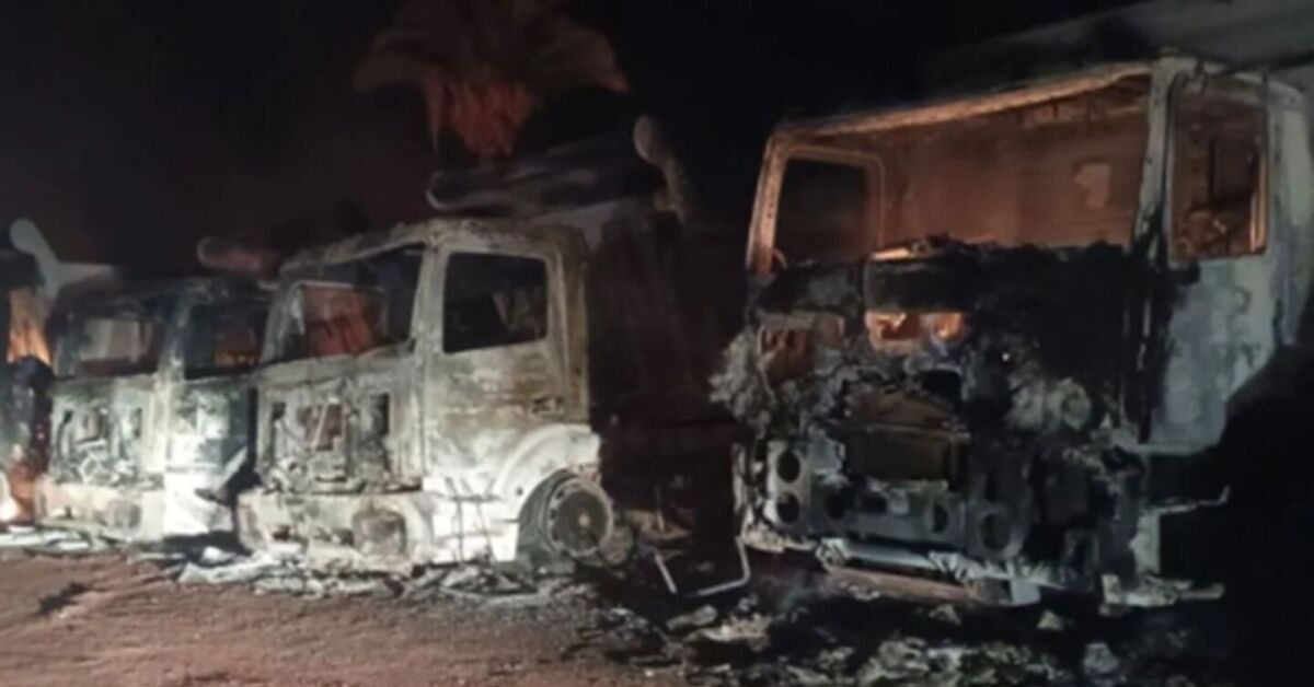 Caminhões queimados após incêndio provocado por vigilante. Foto: PCGO/Divulgação
