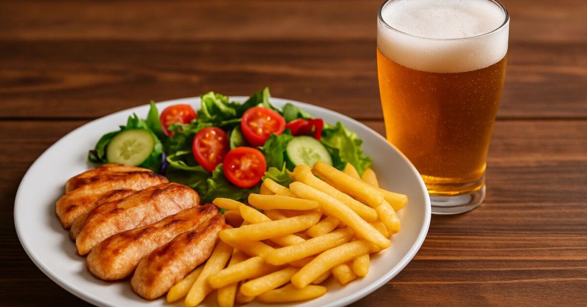 Prato de comida ao lado de um copo de cerveja. Foto: IA