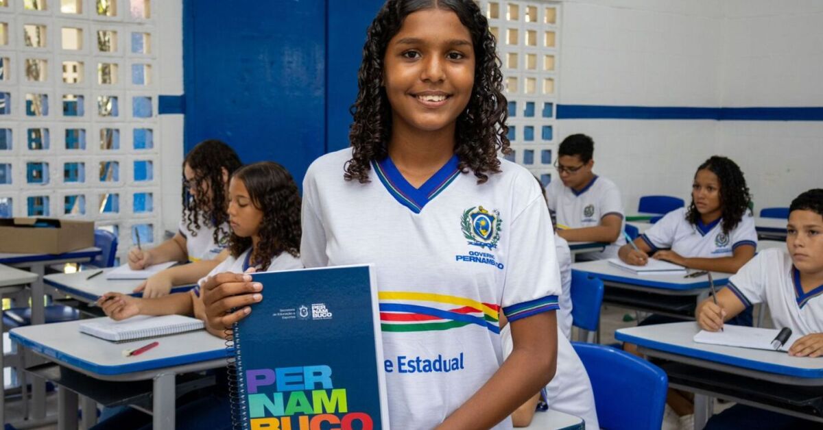 Estudante da Rede Estadaul de Ensino de Pernambuco segurando um caderno com a logo do Governo de Pernambuco. Foto: Josimar OLiveira