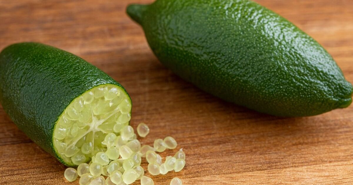 Limão-caviar (finger lime) cortado ao meio para revelar suas pérolas cítricas translúcidas. Foto: Reprodução/IA