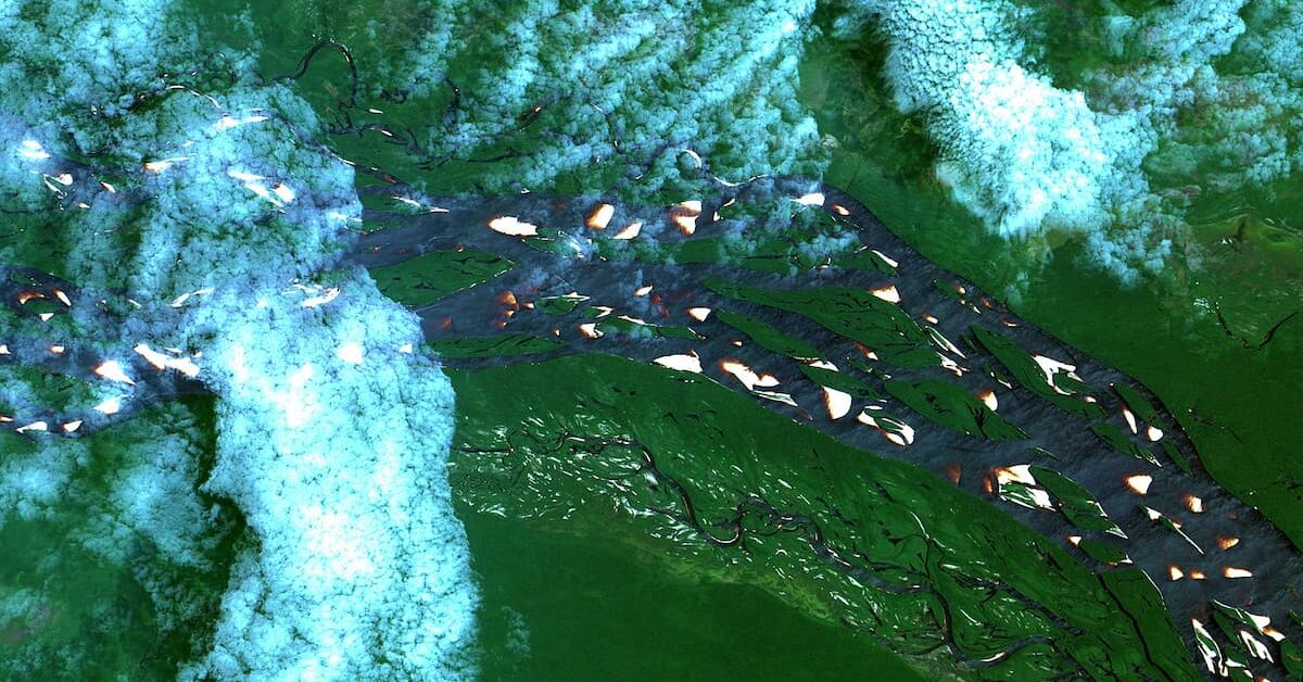 Conheça o Arquipélago de Mariuá, no Amazonas, o maior arquipélago fluvial do mundo. Créditos: Wikimedia.org/satélite sino-brasileiro CBERS-4/INPE