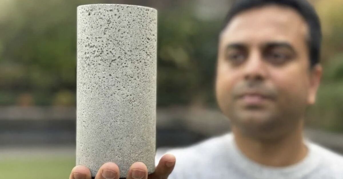 Chamila Gunasekara, coautor da pesquisa da Escola de Engenharia da RMIT, com o Bioconcreto. RMIT/Divulgação