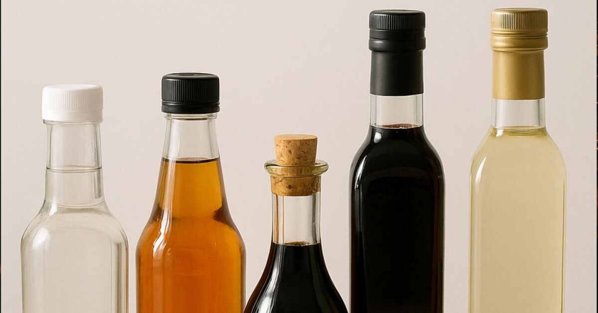 Variedade de vinagres usados na culinária e na limpeza, cada um com características próprias. Foto: Reprodução/IA