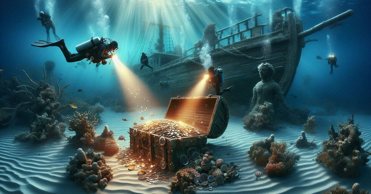 Mergulhadores encontram R$ 53 milhões em ouro e prata de naufrágio histórico na Flórida. Imagem gerado por IA