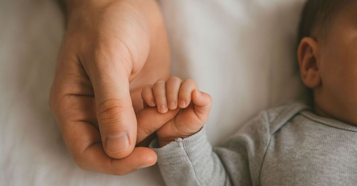 Bebê segurando mão do pai. Foto: Feita por IA.