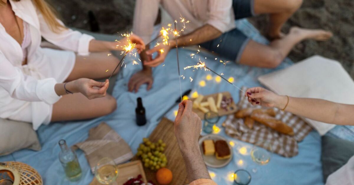 Pessoas celebrando a virada de ano com simpatias tradicionais, entre uvas, roupas brancas, em busca de boas energias. Foto: Freepik