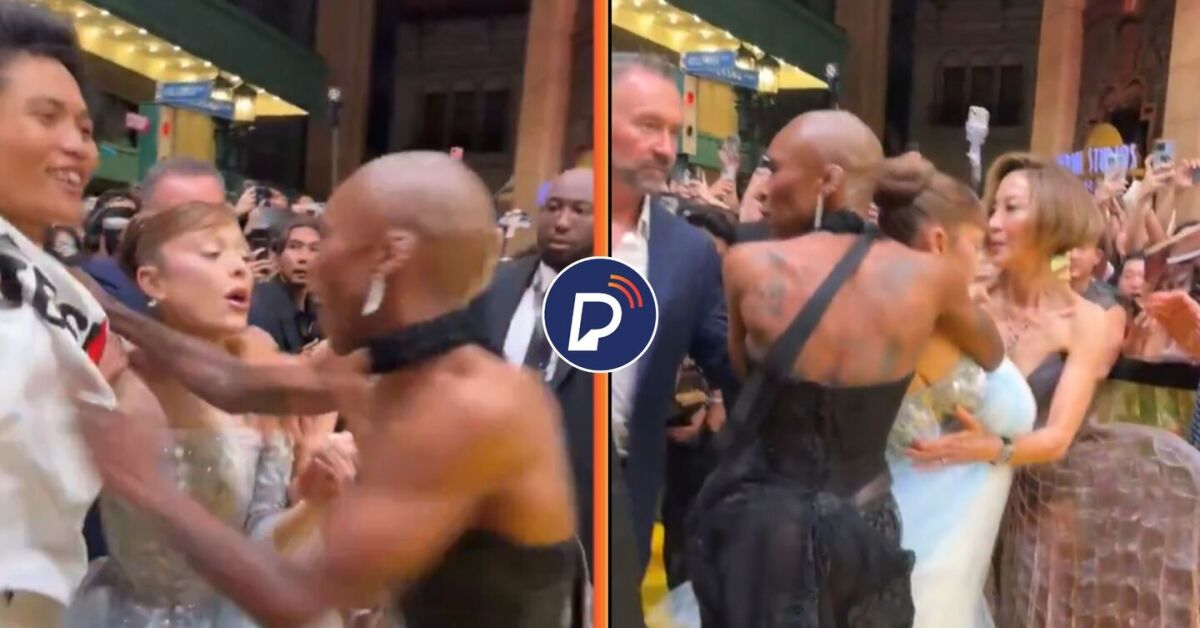 Enquanto o elenco deixava o local, ainda no tapete amarelo, um jovem pulou a barreira de proteção e correu em direção a Ariana, abraçando-a pelo pescoço. A atriz e todos ao redor se assustaram com a situação, e Cynthia Erivo, intérprete de Elphaba, reagiu rapidamente para afastá-lo.