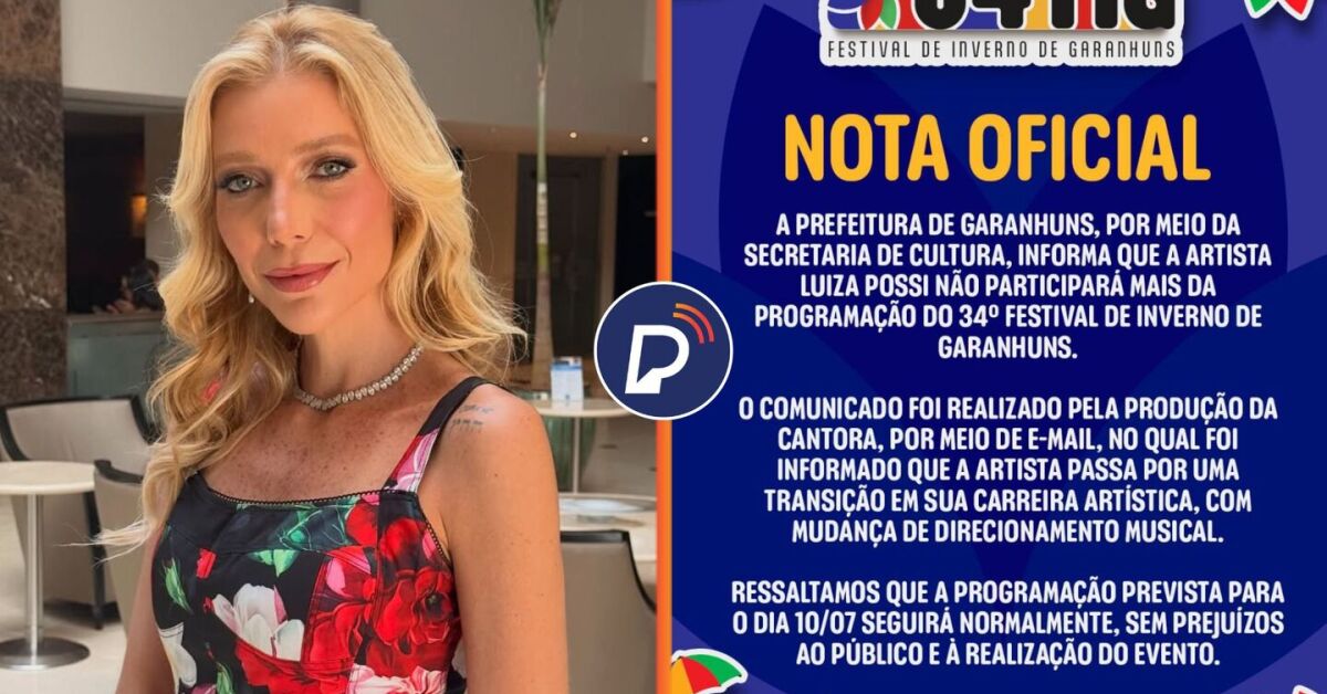 A Prefeitura de Garanhuns informou que a cantora Luiza Possi não fará mais parte da programação do Festival de Inverno de Garanhuns (FIG). A decisão foi comunicada oficialmente pela produção da artista e repassada ao público por meio da Secretaria de Cultura do município.