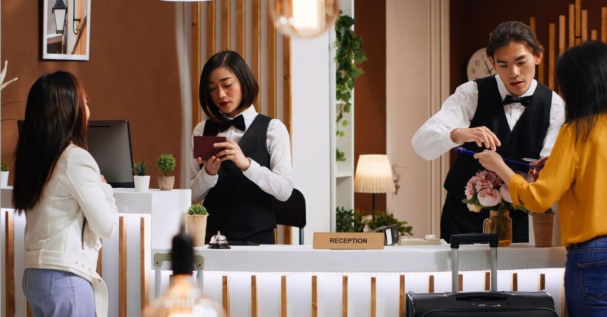 Hóspedes registram entrada na recepção de hotel, agora com regras padronizadas de check-in e check-out em todo o país. Foto: Freepik
