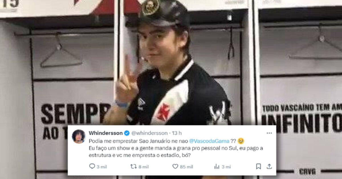 Em seu perfil oficial, Whindersson Nunes escreveu: "Podia me emprestar São Januário né não @VascodaGama?? Eu faço um show e a gente manda a grana para o pessoal no Sul, eu pago a estrutura e você me empresta o estádio, bó?"
