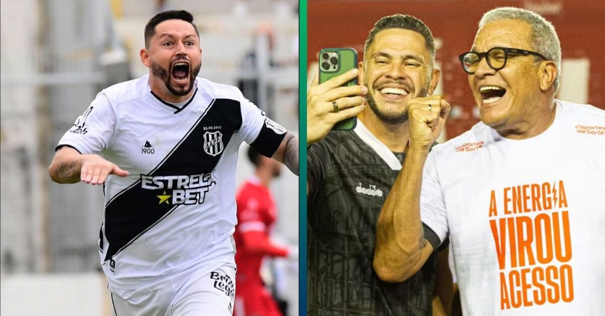 Elvis e Hélio dos Anjos em ligação após acesso do Náutico. Fotos: Marcos Ribolli / Ponte Preta e Gabriel França / Náutico