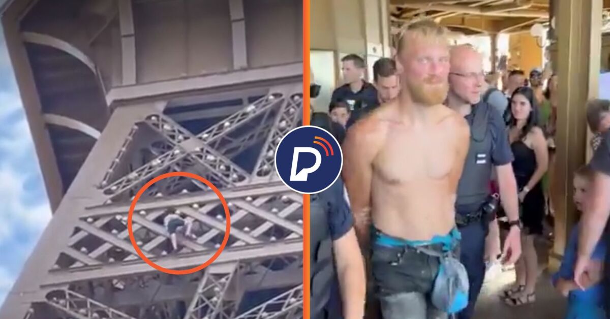 Não foi esclarecido onde ele começou sua escalada, mas ele foi visto acima dos anéis olímpicos que adornam a segunda seção da torre, logo acima do primeiro mirante. A polícia interveio e prendeu o homem.