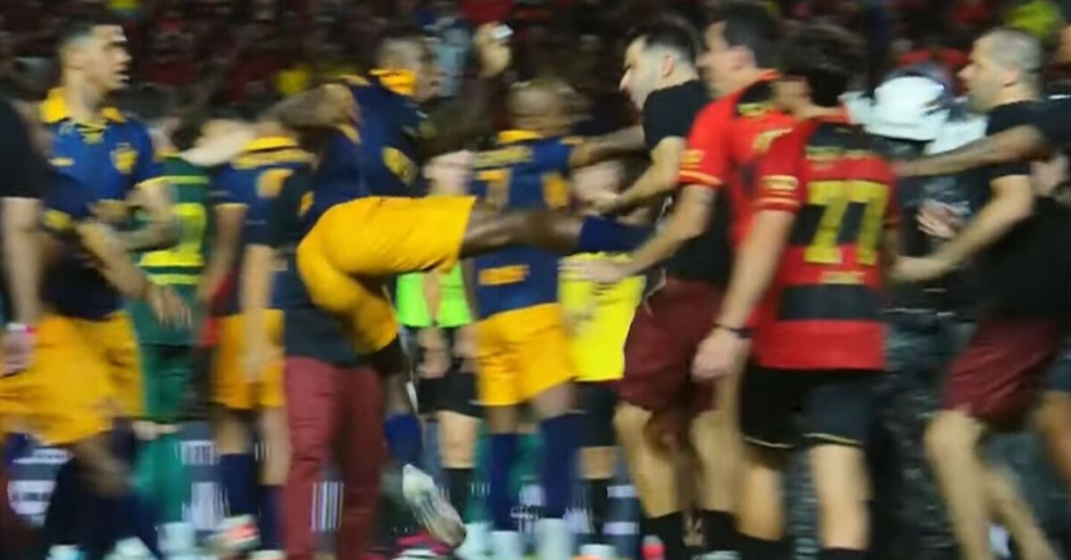 Jogador do Retrô dá voadora em auxiliar técnico do Sport; jogo terminou com oito expulsos Foto: Reprodução / Canal Goat