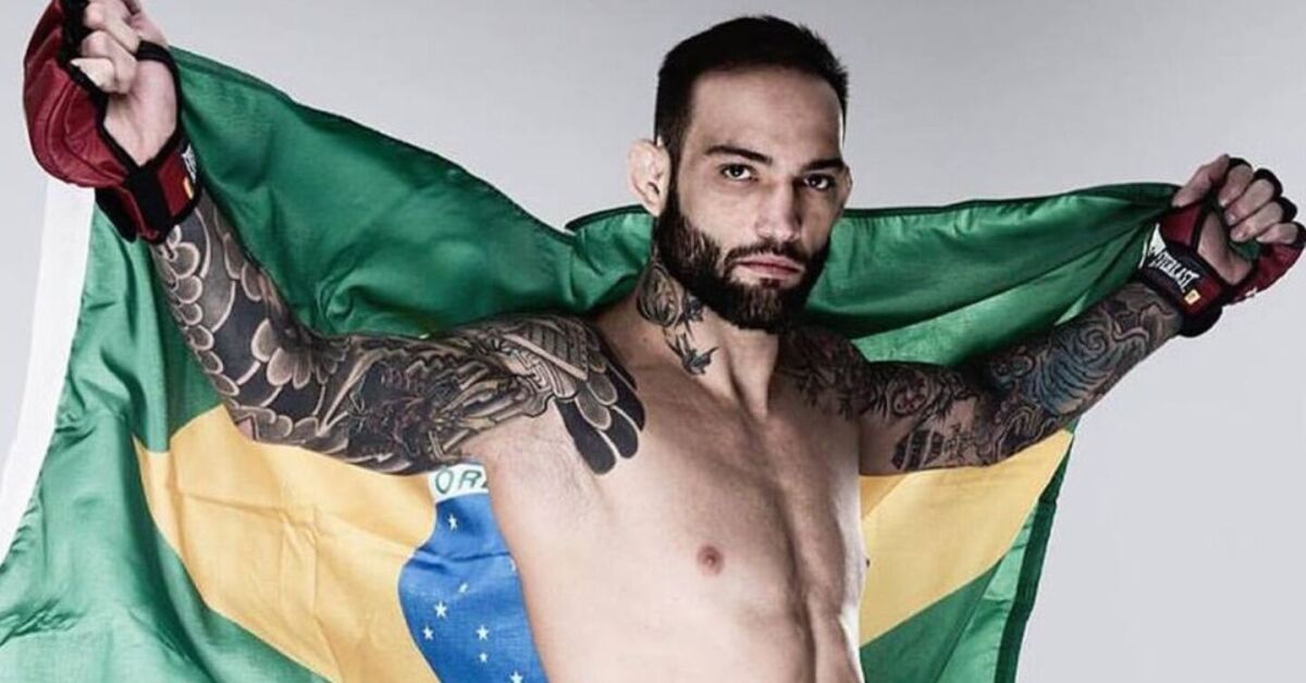 A imagem ilustra o lutador Guilherme Bomba segurando a bandeira do Brasil. Foto: Reprodução/Redes Sociais