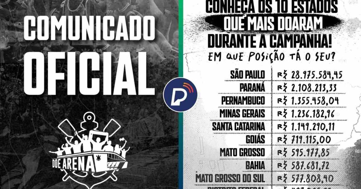 Divulgado oficialmente pelo perfil da Gaviões da Fiel, Pernambuco arrecadou no total R$ 1.355.458,04, ficando atrás apenas de Paraná, na segunda colocação, com R$ 2.108.213,33, e São Paulo, na liderança absoluta, com quase R$ 29 milhões doados.