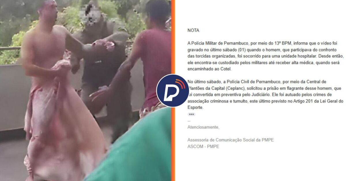 "A Polícia Militar de Pernambuco, por meio do 13º BPM, informa que o vídeo foi gravado no último sábado (01) quando o homem, que participava do confronto das torcidas organizadas, foi socorrido para uma unidade hospitalar. Desde então, ele encontra-se custodiado pelos militares até receber alta médica, quando será encaminhado ao Cotel.