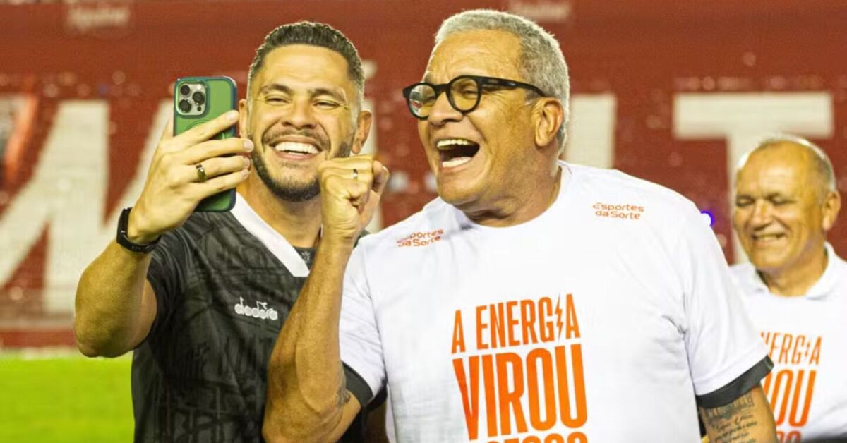 Hélio dos Anjos e Guilherme dos Anjos comemorando acesso do Náutico para Série B. Foto: Gabriel França / Náutico