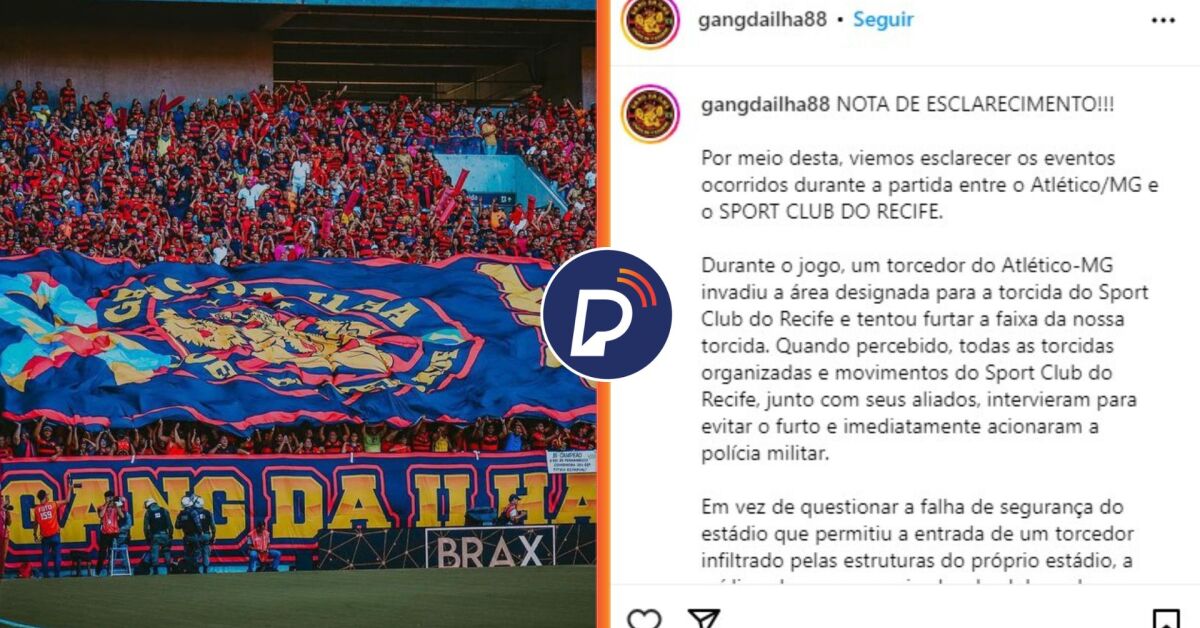 Torcida uniformizada do Sport se divulga nota sobre confusões em jogo contra o Atlético-MG. Arte feita pelo Portal de prefeitura com Foto do perfil @gangdailha88 Torcida uniformizada do Sport se divulga nota sobre confusões em jogo contra o Atlético-MG. Arte feita pelo Portal de prefeitura com Foto do perfil @gangdailha88