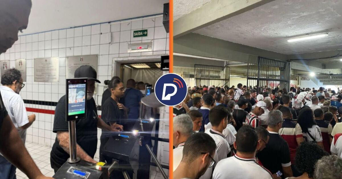 Houve um acúmulo de muitos torcedores próximos aos sensores de biometria facial, causando erro na identificação e consequente perda de tempo para corrigir a leitura em duplicidade.