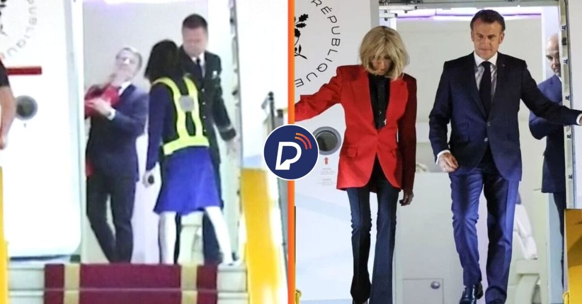 Assim que a porta do avião se abre, Macron surge e, segundos depois, Brigitte estende as duas mãos e pressiona o rosto do presidente com um gesto inesperado. Macron demonstra surpresa por um instante, mas logo se recompõe e acena para a imprensa.