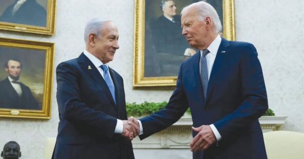Joe Biden e Benjamin Netanyahu apertando as mãos. Foto: Reprodução/Rede Sociais